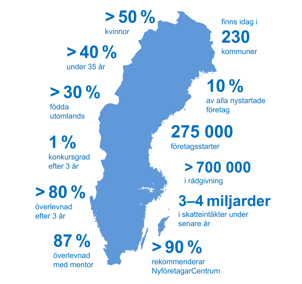 Genom att dagligen sänka trösklar för entreprenörer bidrar Nyföretagarcentrum till att skapa ett större, innovativare och mer livskraftigt näringsliv över praktiskt taget hela Sverige.