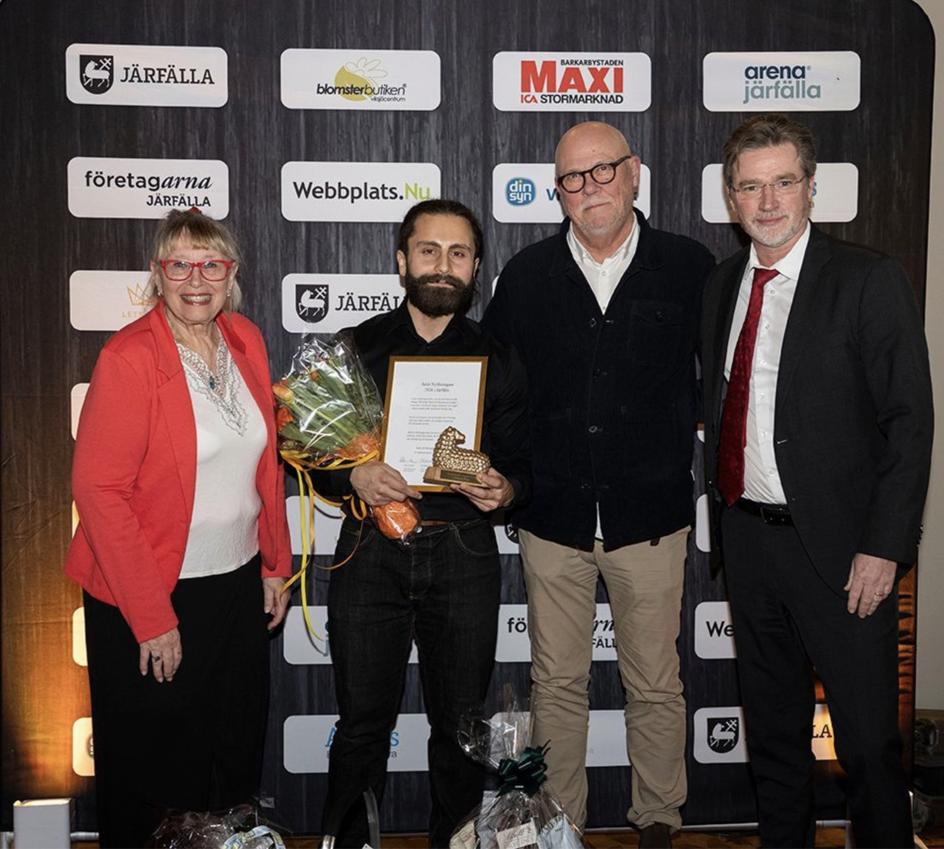Grattis Christian Bitar, skådespelare – som blev årets Nyföretagare 2026 i Järfälla. Christina Erenvidh, Johan Stenius, Nyföretagarcentrum JUB och Peter Åsheim, Allians Revision och Redovisning, delade ut priset.