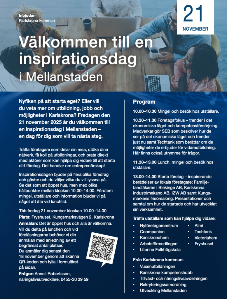 Karlskrona kommun bjuder in till inspirationsdag och öppet hus på Fryshuset i Kungsmarken, den 21 november mellan klockan 10.00-14.00. Kom och bli inspirerad och lyssna till andra som tagit steget till eget, samt hör mer om trender i det ekonomiska läget och kompetensförsörjning.