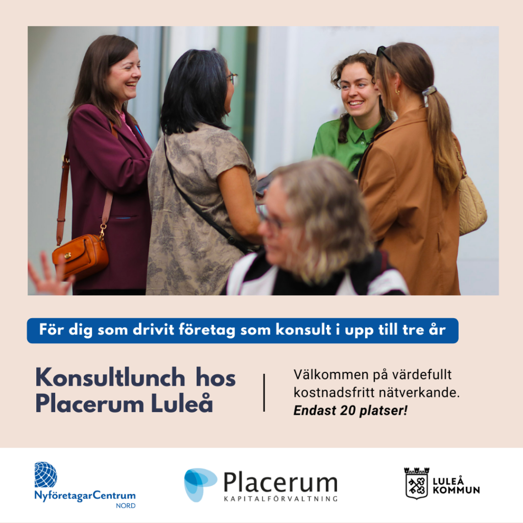Att vara konsult kan kännas ensamt ibland särskilt i början. Den 17 oktober bjuder vi in dig som säljer din egen tid och driver eget sedan max tre år till Placerum i Luleå. Här får du möta andra företagare i samma sits, bygga nätverk, utbyta erfarenheter, tips och kanske hitta nya affärsmöjligheter?