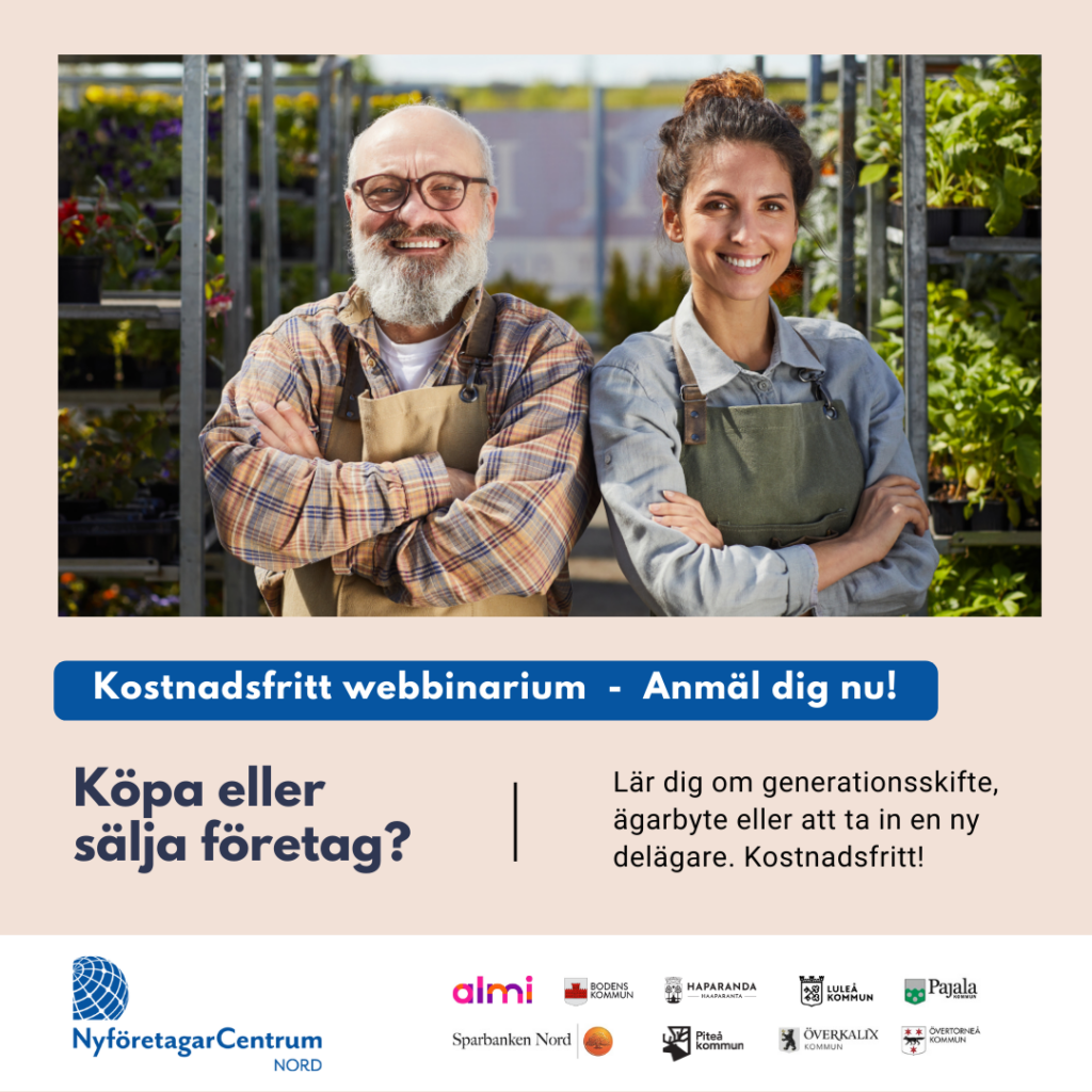 Det här webbinariumet är för dig som funderar på att sälja eller lämna över ditt företag eller vill köpa/ta över ett befintligt i Boden, Haparanda, Luleå, Pajala, Piteå, Överkalix och Övertorneå.