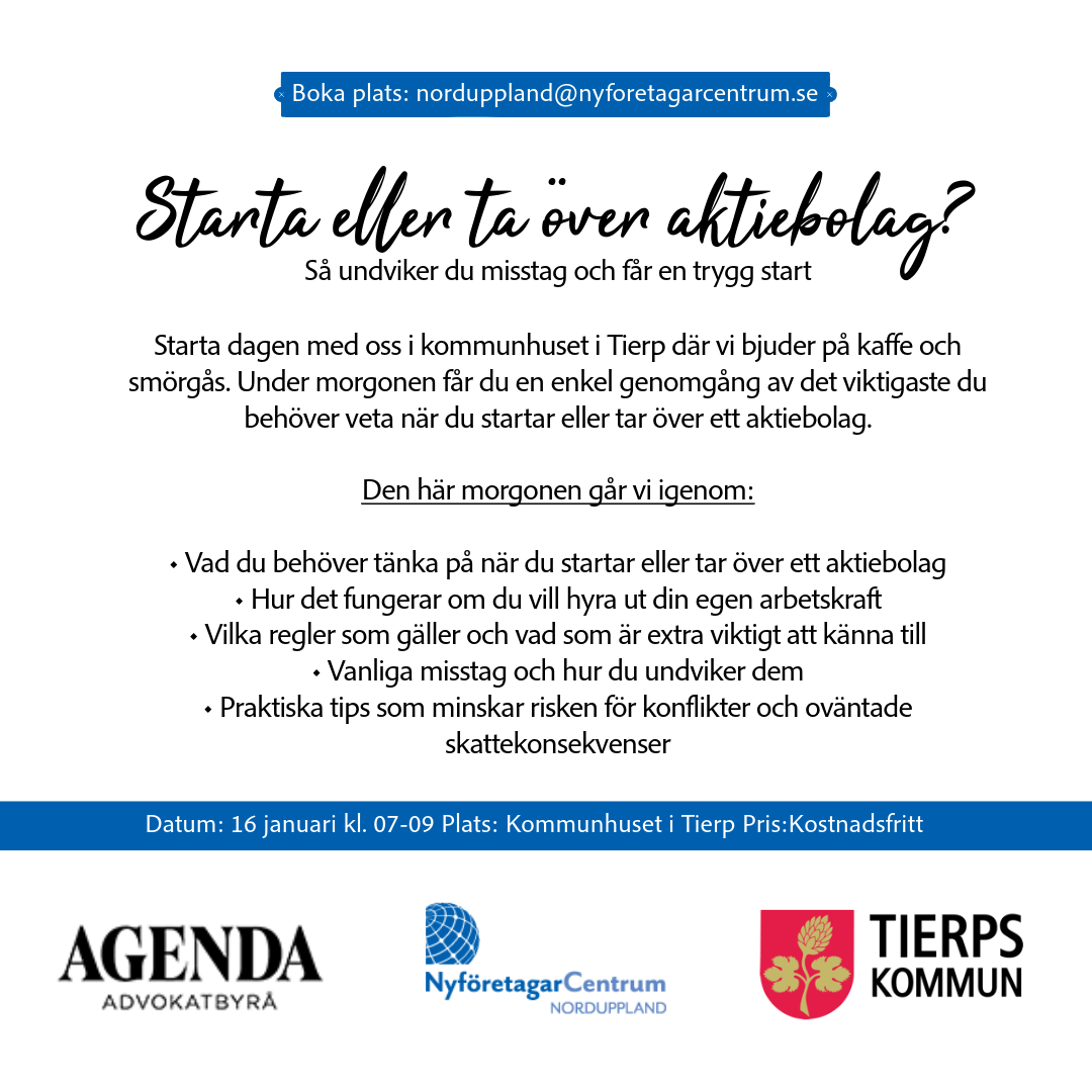 Starta dagen med oss i kommunhuset i Tierp där vi bjuder på kaffe och smörgås. Under morgonen får du en enkel genomgång av det viktigaste du behöver veta när du startar eller tar över ett aktiebolag.