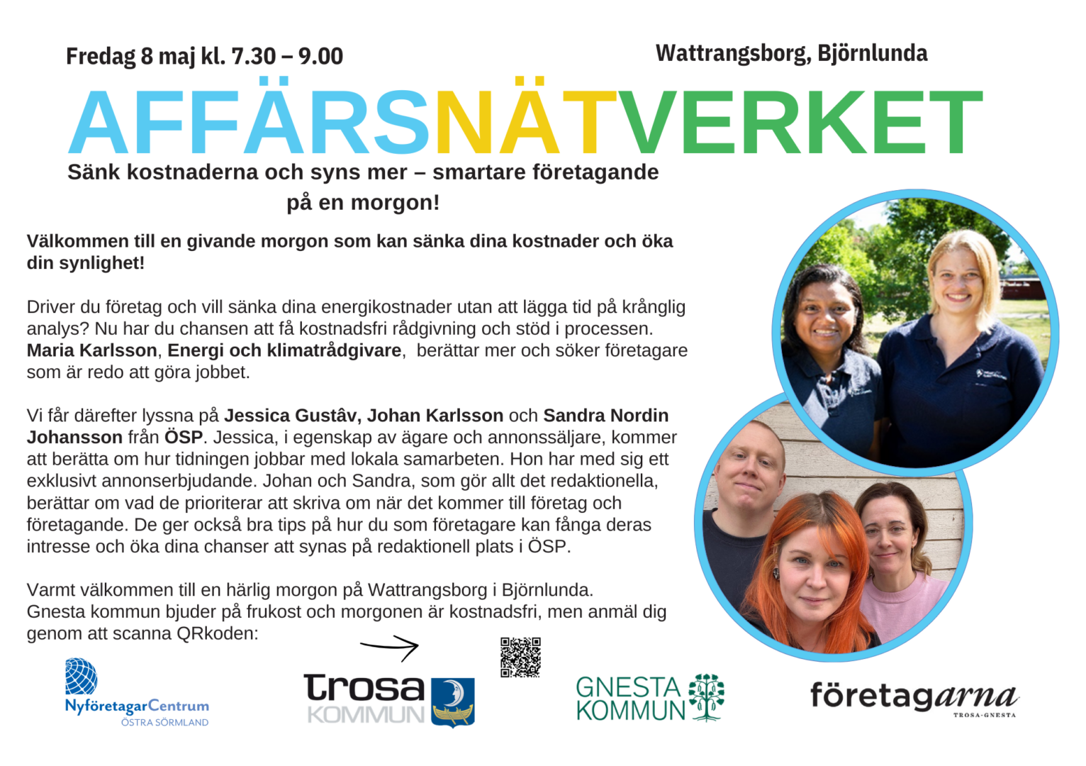Gnesta kommun bjuder på frukost och morgonen är kostnadsfri, men anmäl dig genom att klicka på länken:https://simplesignup.se/event/232456-affaersnaetverket-gnesta
