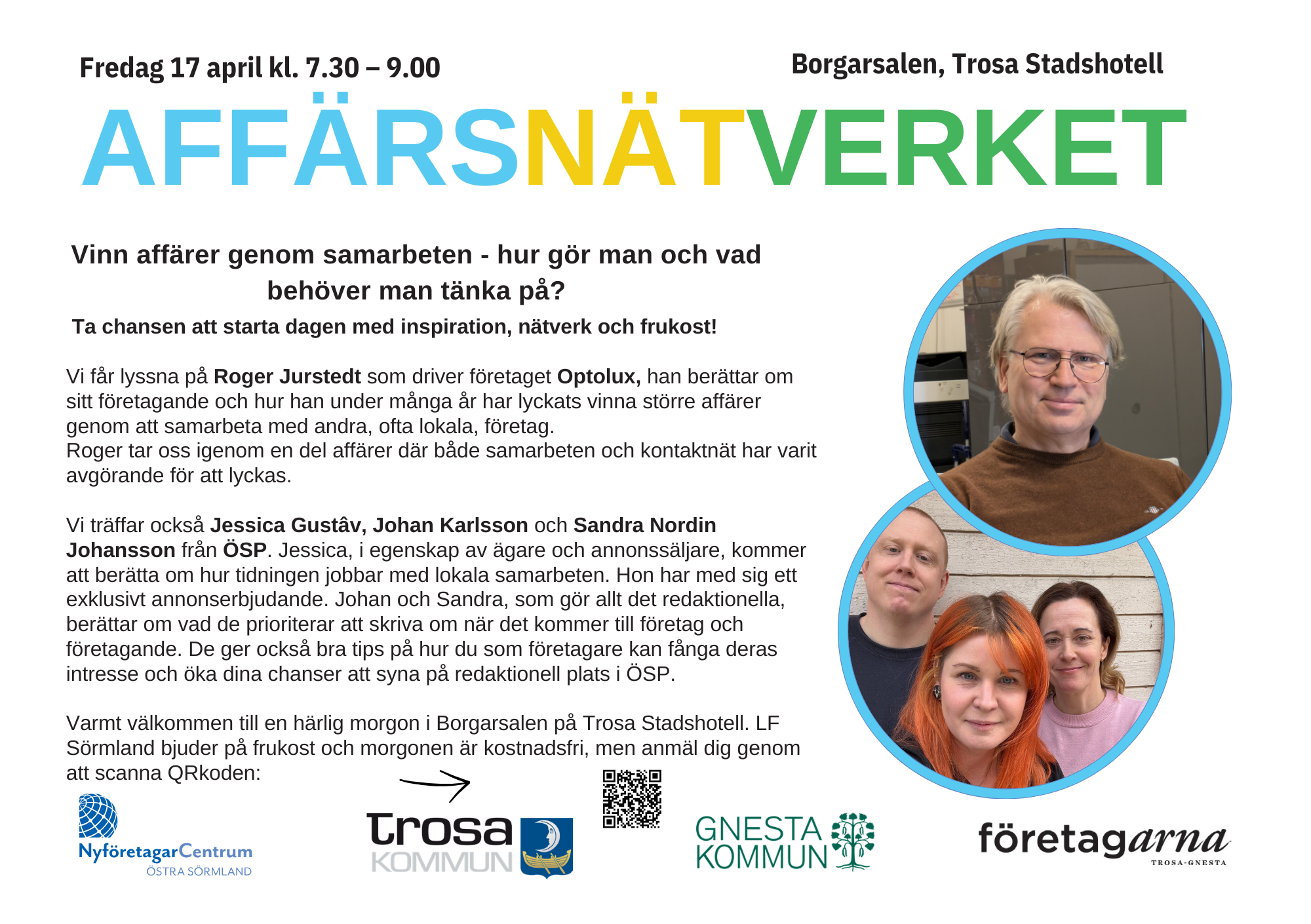 NÄR: 07.30-09.00 17 aprilVAR: Borgarsalen, Trosa Stadshotell Vinn affärer genom samarbeten – hur gör man och vad behöver man tänka på? Ta chansen att starta dagen med inspiration, nätverk och frukost! Vi får lyssna på Roger Jurstedt som driver företaget Optolux, han berättar om sitt företagande och hur han under många år har lyckats vinna […]