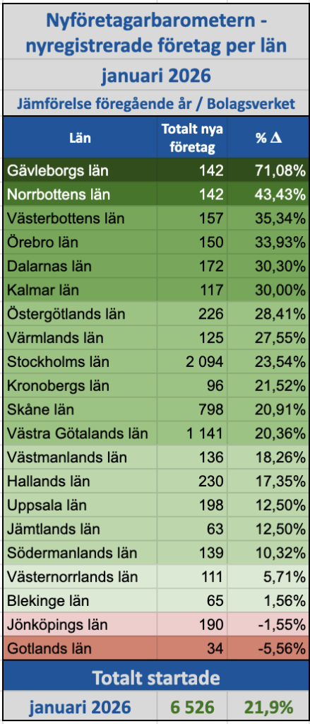 Gävleborgs län toppade trenden med en imponerande ökning på 71 %, motsvarande 142 nya företag, jämfört med 83 nya företag januari 2025.