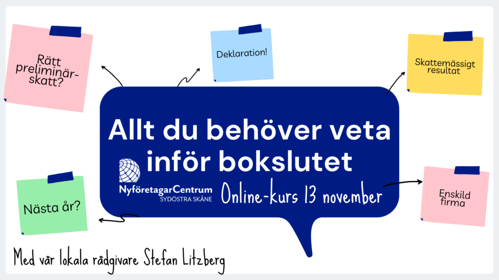 Kalenderåret 2025 tackar snart för sig! Vad är viktigt att tänkta på inför stundande bokslut? Det är en fråga som vi rätar ut den 13 november när Nyföretagarcentrum Sydöstra Skåne arrangerar en kostnadsfri kvällskurs online med tema bokslut och hur du bäst förbereder dig för det.