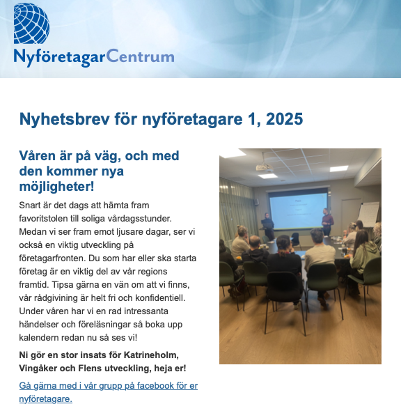 Läs vårt senaste nyhetsbrev till Nyföretagare här: Nyhetsbrev.5.2025 Nyhetsbrev.4.2025